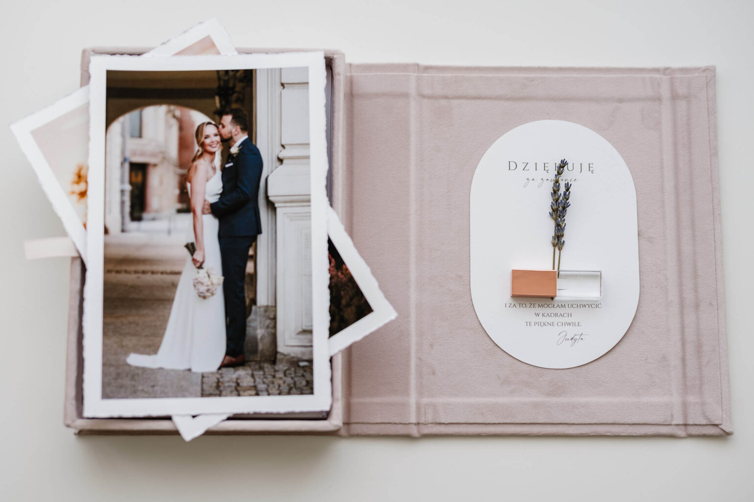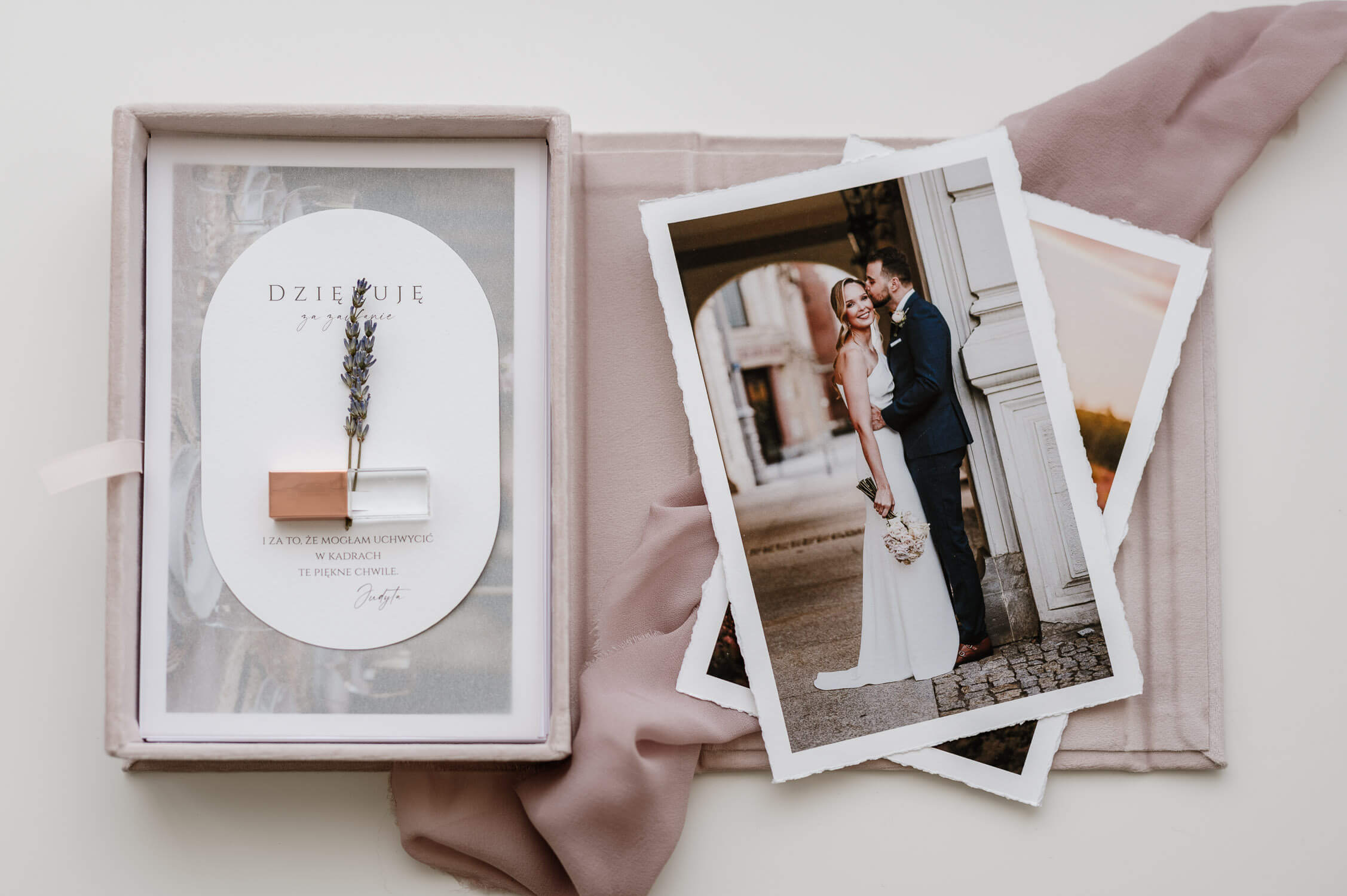 Zdjęcia z Waszego reportażu ślubnego możecie otrzymać również na pendrivie. Wybrane przez Was kadry, mogę oddać na pięknym matowym papierze premium w rozmiarze 15 × 23 cm lub na wysokiej jakości odbitkach jedwabnych. A może interesują Was personalizowane fotoalbumy?